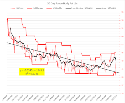 Why did this measure choose to plummet on this date? Vacation ended, and discipline, and exercise, resumed. Thu Aug 4 was preceded by being baked at the volleyBall factory Tue 2 and Wed 3. While on fast / low kCal. AKA "hard work".